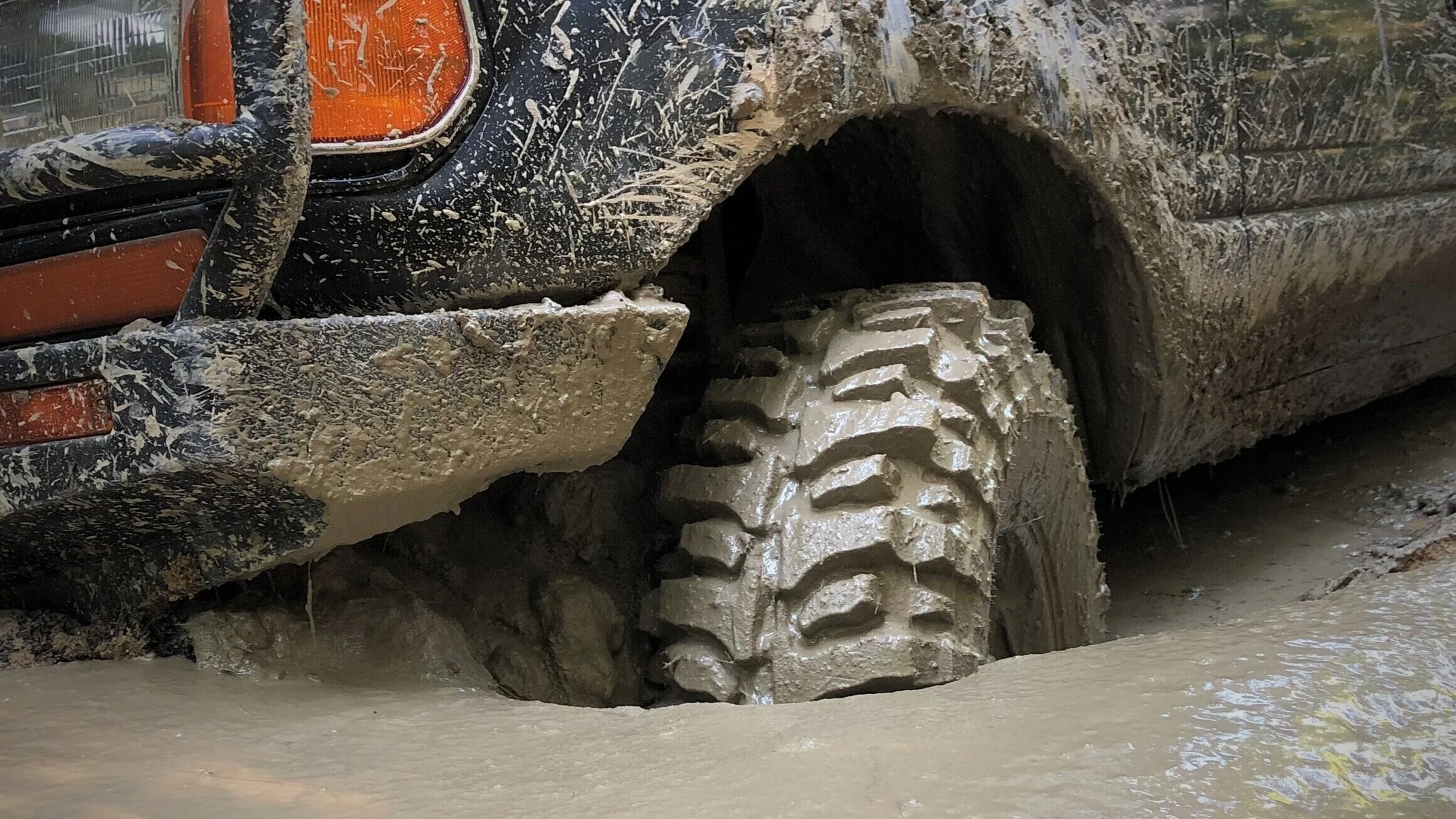 The first thing you should do is STOP ACCELERATING. Spinning tires dig ruts; deeper ruts mean a harder time. Once, you realize you’re stuck, get out and look at how you’re stuck and assess how bad it is. You may want to use your hands to dig some of the mud away from the tire, or you may be able just to repeatedly turn your wheel left and right to move the mud away. Once you have a wider rut around all sides of the tire, you can try to slowly move back and forward in a “rocking” motion to build up momentum and eventually get out of the rut.